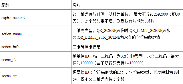 每次創建二維碼ticket需要提供一個開發者自行設定的參數(scene_id),分別介紹臨時二維碼和永久二維碼的創建二維碼ticket過程。