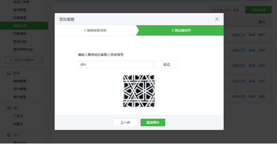 開啟功能后,需要添加客服人員,為其綁定微信號(hào),綁定微信號(hào)時(shí)需要客服人員在自己的手機(jī)微信中接受邀請(qǐng)。