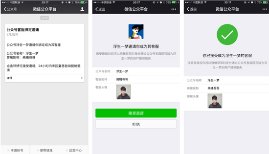 客服人員在手機(jī)微信中收到并接受邀請(qǐng)的流程: