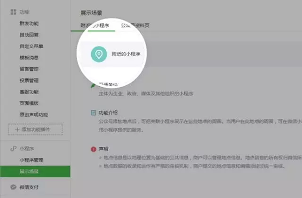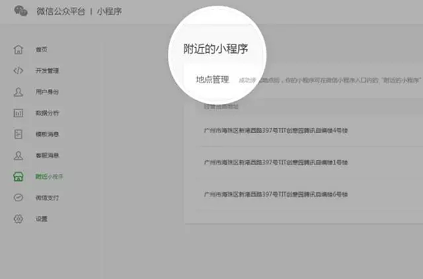 公眾號后臺新增附近的小程序功能,申請開通后支持添加地點。