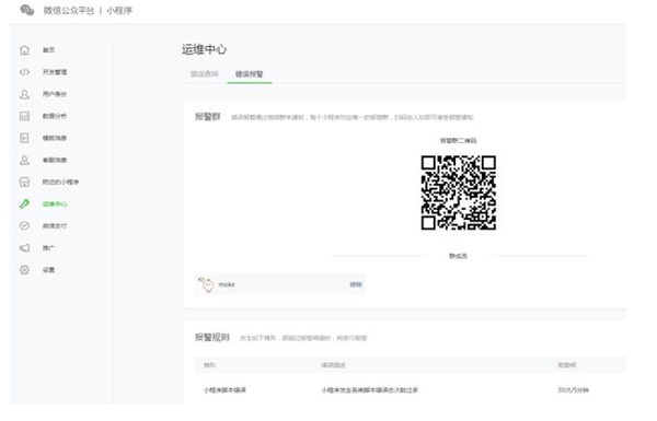 在運(yùn)維中心,開發(fā)者可掃描二維碼加入小程序報(bào)警群。當(dāng)小程序在運(yùn)行中出現(xiàn)問題時(shí),系統(tǒng)會(huì)推送信息告知報(bào)警群內(nèi)的成員。