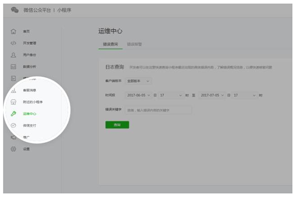 為了幫助開發(fā)者及時(shí)發(fā)現(xiàn)小程序運(yùn)行中出現(xiàn)的問題,公眾平臺(tái)新增小程序運(yùn)維中心。開發(fā)者可以在運(yùn)維中心查詢小程序最近30天內(nèi)出現(xiàn)的錯(cuò)誤信息,快速修復(fù)問題。