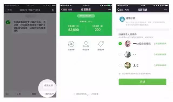 過去,商戶想要查看經營數據,需要在PC端輸入帳號、密碼,登錄后臺查看,無法實時管理。現在,商戶只需通過微信支付商戶助手公眾號-我的帳號-經營數據,管理員根據流程指引開通該功能,還可以設置員工一起使用該功能,真正做到經營數據管理移動化。