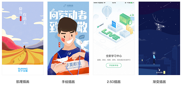 B、插畫:這種形式的閃屏給用戶一種很溫暖的感覺,很容易會(huì)引起共鳴,喚起我們某個(gè)時(shí)間段的回憶。目前,據(jù)天津網(wǎng)站建設(shè)所了解插畫手法用的比較多且比較流行的是:肌理插畫、手繪插畫、漸變插畫等。
