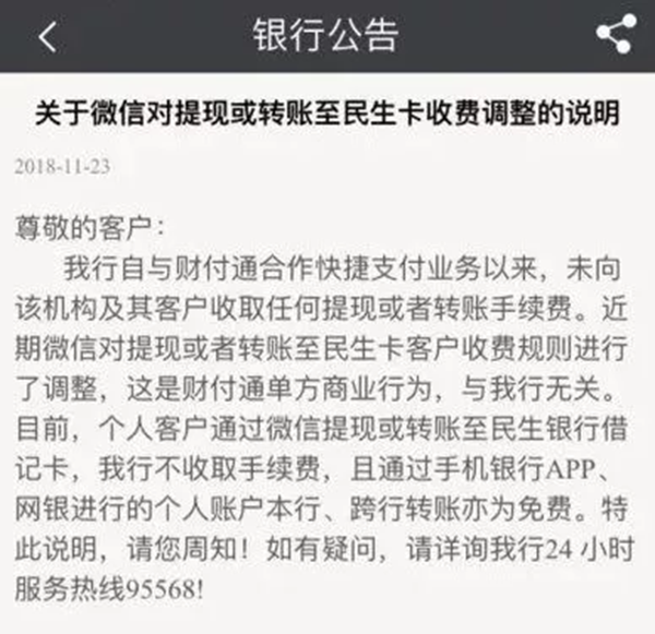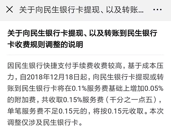 近日微信發(fā)布了一則公告稱:自2018年12月18日開始,民生銀行卡體現(xiàn)和轉(zhuǎn)賬將在加收0.05%手續(xù)費(fèi),對此,民生銀行發(fā)布公告稱:收費(fèi)為財付通單方面行為,與民生銀行無關(guān)……吃瓜群眾表示:和誰有關(guān)都不想付啊……