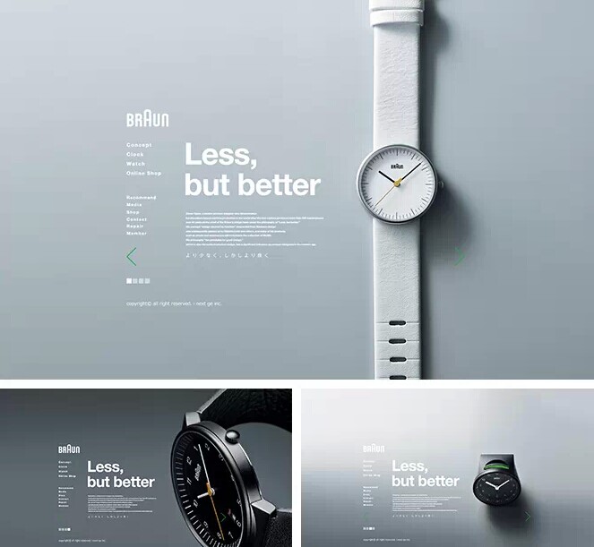 例如:“獸人必須死”首發(fā)引導頁面,周圍大面積留白,并結合簡潔的排版,讓頁面模塊之間區(qū)分明顯,視覺集中,很好的給用戶引導,給人一種精致和輕松感。例如:BRAUN博朗,整個頁面,簡潔的圖片與文字的排版,讓視線非常集中,這樣用戶快速的將注意力集中到內容上去,非常符合他們的主題“Less,but better”,給人留下回味、想象的空間。