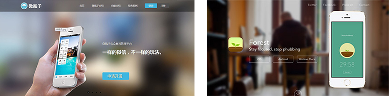 二、目前,一些抽象隱晦的、大尺寸的、虛化或模糊的圖也隨處可見。但是使用虛化或模糊圖的情況會有些復雜。它只有在圖片本身品質很好的情況下才會帶來好的效果,如果為了掩飾圖片質量的低劣而去虛化,效果會適得其反。所以我們必須得清楚為什么要把圖片虛化,比如天津網站設計——文率科技做的微瓶子這個網站需要非常明顯的虛化后才有更好的效果,而Forest 這個網站只需要把人的寫實背景輕微虛化就可以了。
