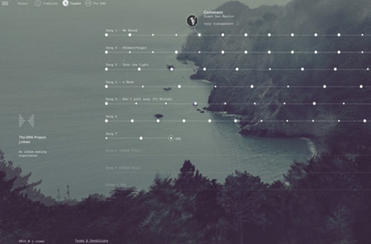 The DNA Project 是一個極為創新的音樂網站項目,它為用戶提供了截然不同的音樂制作流程,時尚又不同凡響。每首歌都被劃分為關鍵的音樂節點、音軌背后的故事和參與的音樂家等幾個部分,這個項目讓用戶與音樂人們一同制作音樂。