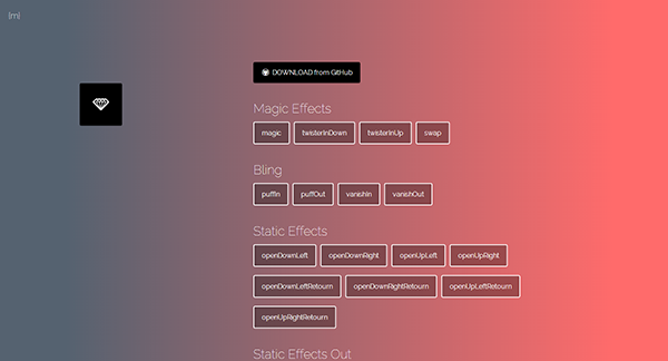 Magic CSS3 Animations是一個特殊效果的CSS3動畫庫,你可以盡情的免費用于你的web項目之中,為您的項目增添不一樣的動態效果,操作非常的簡單,只需簡單的引用CSS樣式:magic.css或精簡版magic.min.css即可。