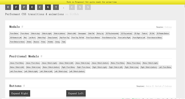 針對不同UI的CSS3動畫和過渡效果集,包含了豐富的CSS3動畫和過渡效果,包括:Modal、overlay、button、list、listscroll、Caption等等,相信如果你需要支持動態CSS3動畫或者過渡效果的話,這一套完整的UI動畫及其過渡效果解決方案肯定會讓你滿意!
