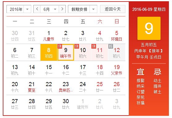 2016年6月9日(周四)至6月11日(周六),為放假時間,為期三天,6月12日(周日)正常上班。
