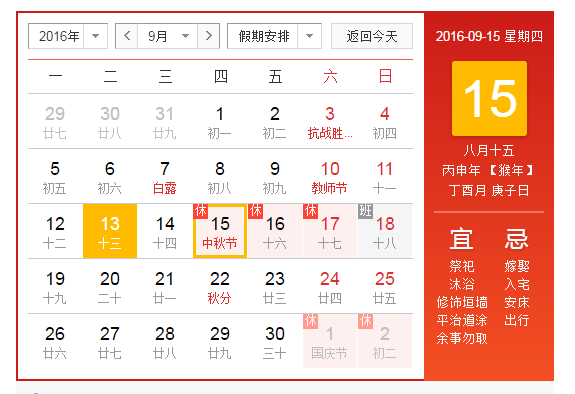 1、放假時間:2016年9月15日至9月17日放假,共3天。9月15日(星期四,農歷中秋節當日)為國家法定節假日;9月17日(星期六)公休;9月18日(星期日)公休調至9月16日(星期五);9月18日(星期日)照常上班。