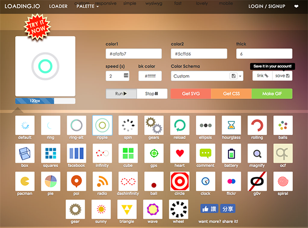 Loading.io網(wǎng)站是一個(gè)屬于加載動(dòng)畫生成的網(wǎng)站,如果目前你正在從事app網(wǎng)站的設(shè)計(jì)和研發(fā),那么勢必需要為你的app,網(wǎng)站或項(xiàng)目創(chuàng)建一個(gè)加載動(dòng)畫,若目前你正因?yàn)檫@事而頭疼的惡化,那么不妨來Loading.io網(wǎng)站,它可以幫助你生成一個(gè)你最喜歡的,有SVG、CSS和GIF導(dǎo)出功能,在一定的程度上幫您節(jié)省一部分工作時(shí)間,提升工作的效率。