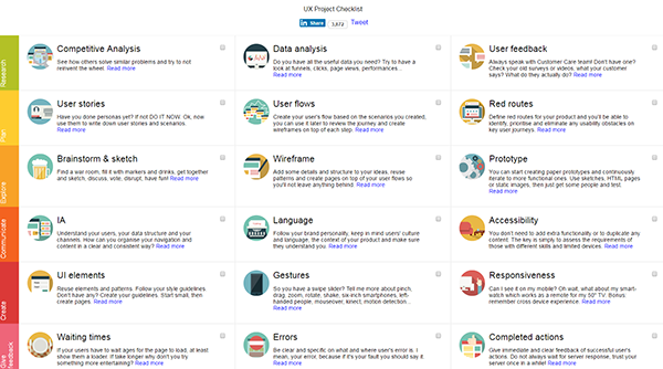 當(dāng)你在工作中創(chuàng)建并開始了一個(gè)UX項(xiàng)目的時(shí)候,你必須得保證每一步都做得非常的到位,保證你在整個(gè)過程中不忘記任何事情,對于每一個(gè)細(xì)節(jié)的把控都非常的到位,UXchecklist將會(huì)非常有效的幫助你列舉出你正在進(jìn)行著的步驟,這樣的話在一定的程度上它能夠幫助你贏的一些晚上的睡眠時(shí)間哦!