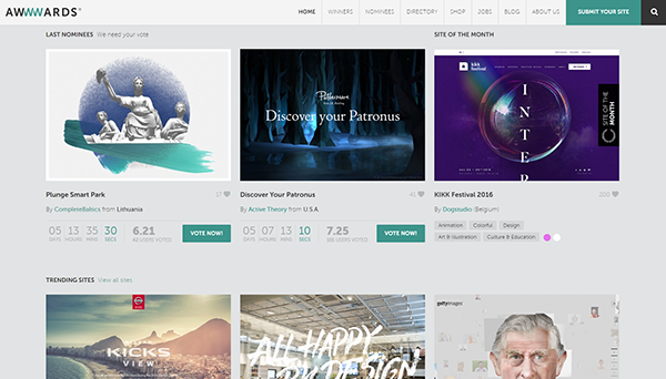 Awwwards是一個(gè)專門為設(shè)計(jì)精美的網(wǎng)站以及富有創(chuàng)意的網(wǎng)站頒獎(jiǎng)的網(wǎng)站,Awwwards上的獲獎(jiǎng)網(wǎng)站來自全世界優(yōu)秀的網(wǎng)頁設(shè)計(jì)師之手,網(wǎng)站每天評選出一個(gè)“Site of the Day”。如果您想增加自己的視野,想提升自己的設(shè)計(jì)水平,想學(xué)習(xí)國外優(yōu)秀設(shè)計(jì)網(wǎng)站的設(shè)計(jì)思路,Awwwards一定可以幫到你,在這里你可以找到大量的實(shí)例。
