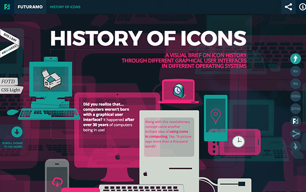 圖標設計需要契合整個設計策略,仔細審視你所需要設計的內容和風格,再將圖標和流行的元素結合起來,營造出符合現代風格的美學特征。另外,圖標最大的特性就是它具有靈活性,它從形狀到細節都可以充滿藝術性,從手繪風到扁平化,從精致擬物到藝術化處理都很容易實現。而上面這個關于圖標歷史的網站就展示了多年來圖標風格的演變,這些圖標所呈現出來的風格、色彩、使用方法和規格都非常值得設計師們研究學習。