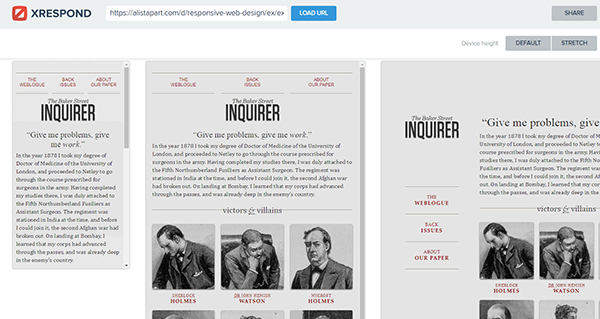 Xrespond絕對對得起“虛擬設(shè)備實驗室”,這個稱號,通過Xrespond 打開網(wǎng)頁,你可以看到它在不同屏幕尺寸下的樣子,整個布局是橫向的,所以你需要橫向滾動頁面才能看到它所有的樣子。屏幕上方的標(biāo)簽會標(biāo)識出它是為什么設(shè)備所匹配的,在下拉框當(dāng)中能夠選出不同品牌不同型號的智能手機(jī)、平板和筆記本屏幕,以預(yù)覽效果。